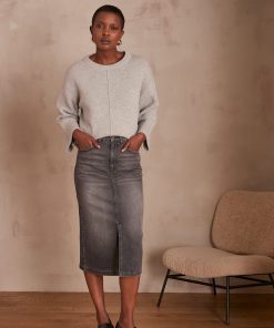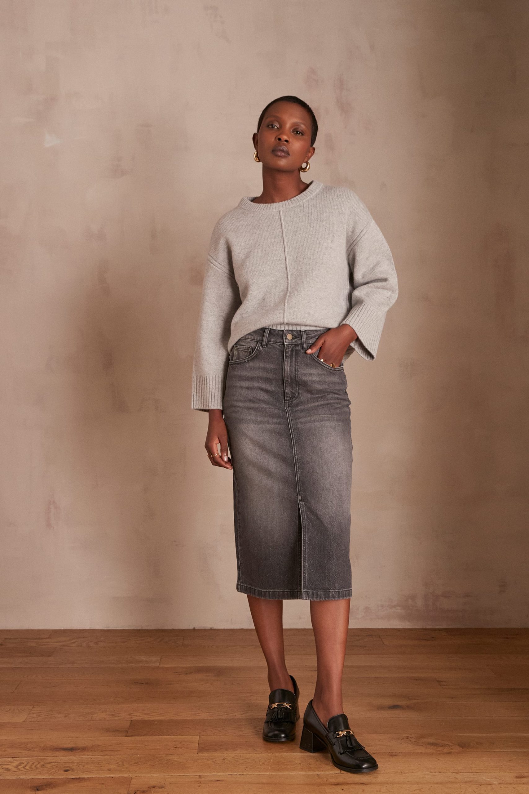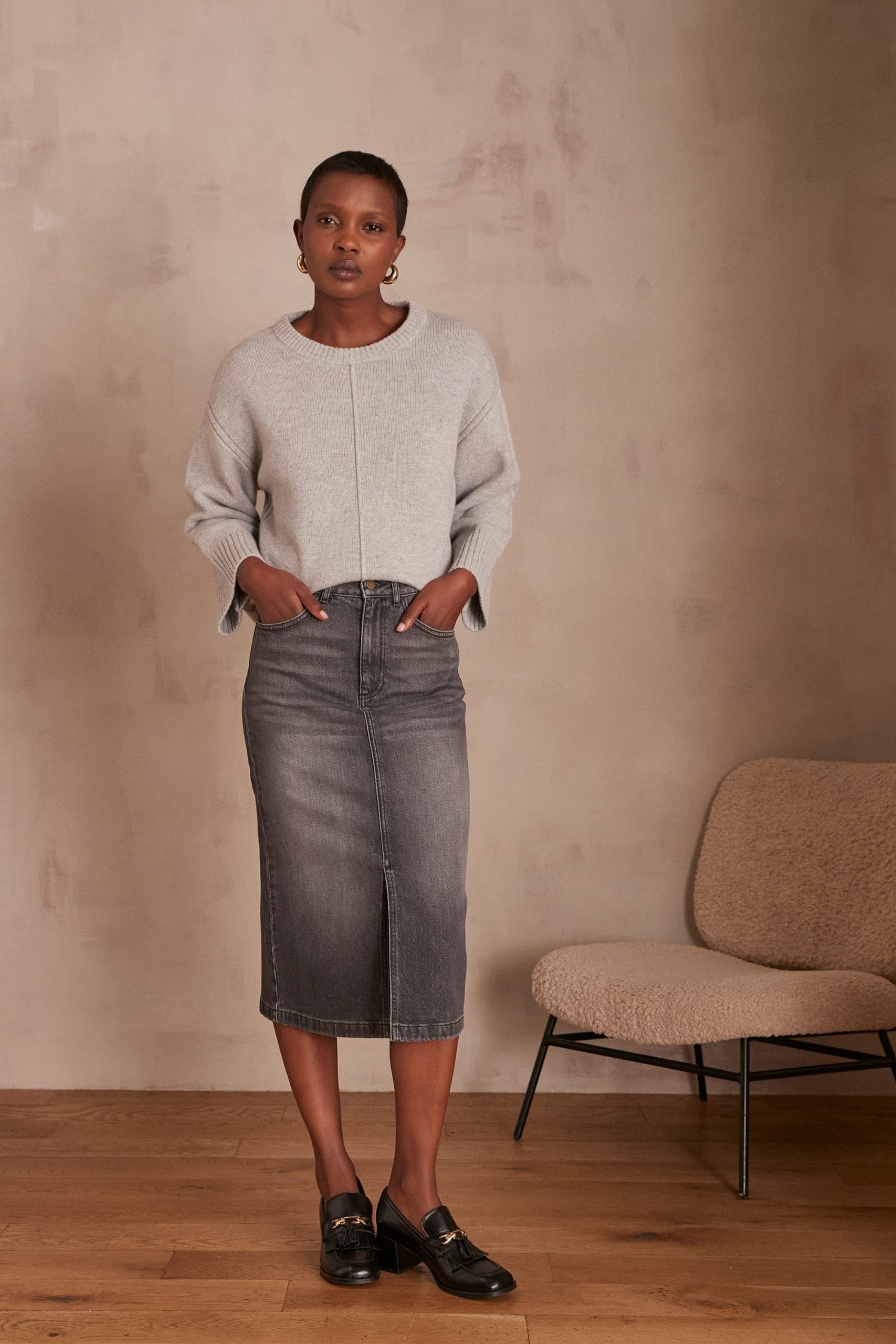 Aliane is 1.73 m (5'7") tall and is wearing a size 36. The model is wearing the CORLEY jumper and the RIVA loafers with the BIRDY skirt.skirts