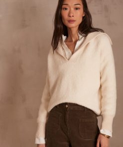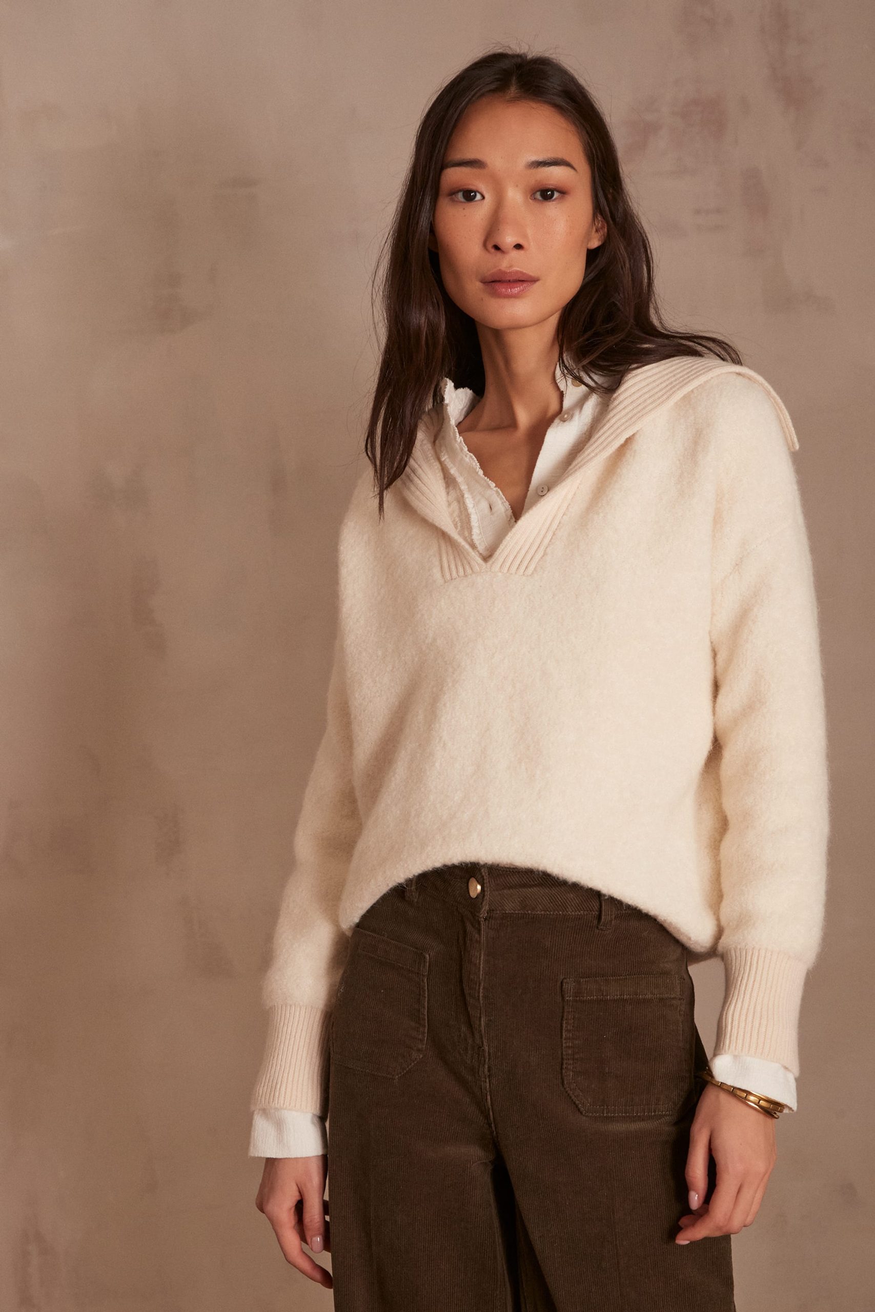 Bibi is 1.8 m (5'9") tall and is wearing a size 36. The model is wearing the LUNA trousers and the SEVAN jumper with the BROOKE blouse.blouses-and-shirts