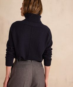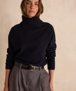 Adopt an elegant and minimalist look with this navy turtleneck jumper, tucked into pleated trousers and belted to subtly highlight the waist.