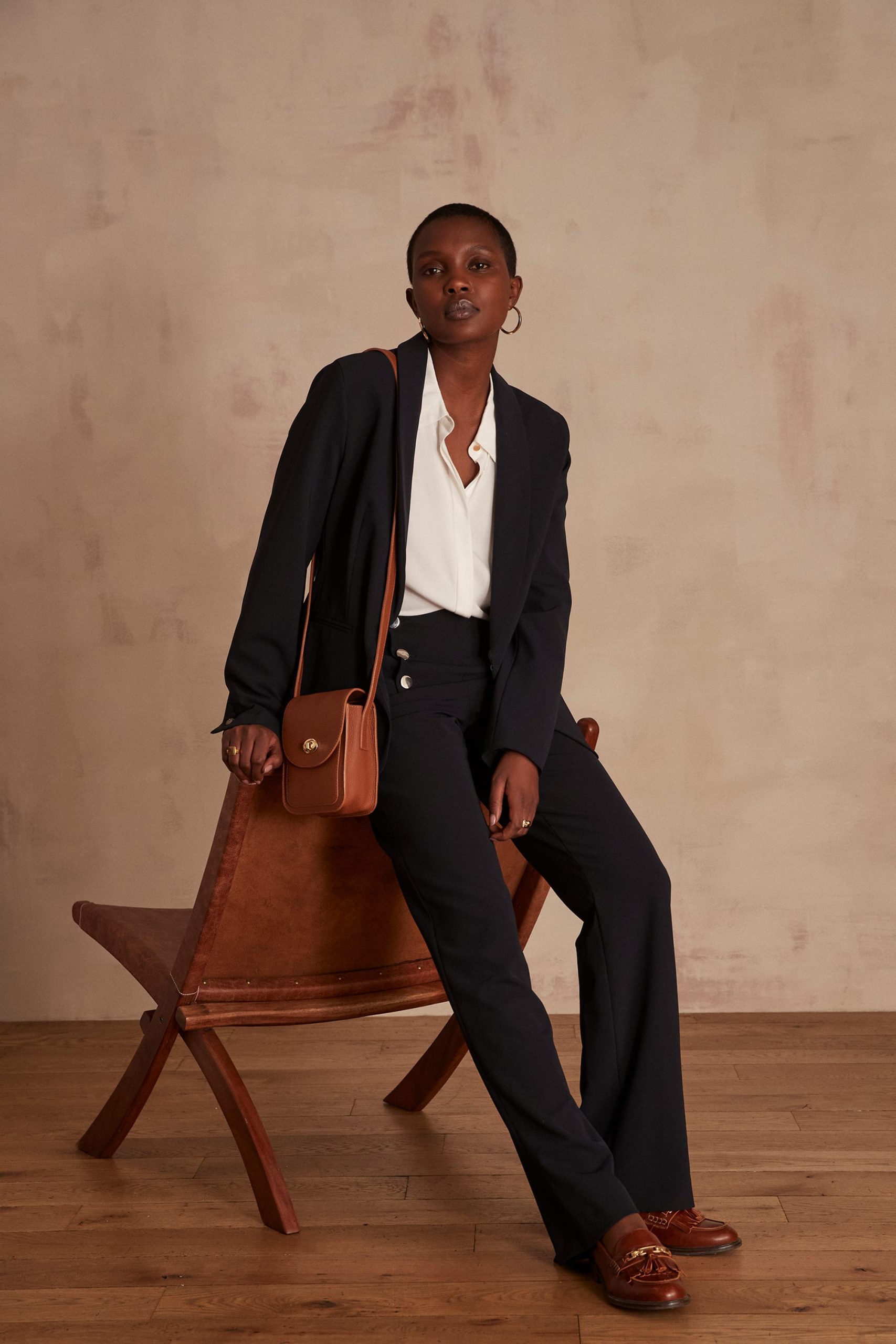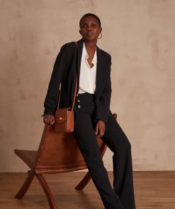 Length for a size 36: 82.5 cm – wide leg – high waist -made in Romania. Aliane is 175 cm (5'7") tall and is wearing a size 36. The model is wearing the MATEA shirt, REINE jacket and LISON loafers with the HUBERT trousers, and carrying the INES bag.