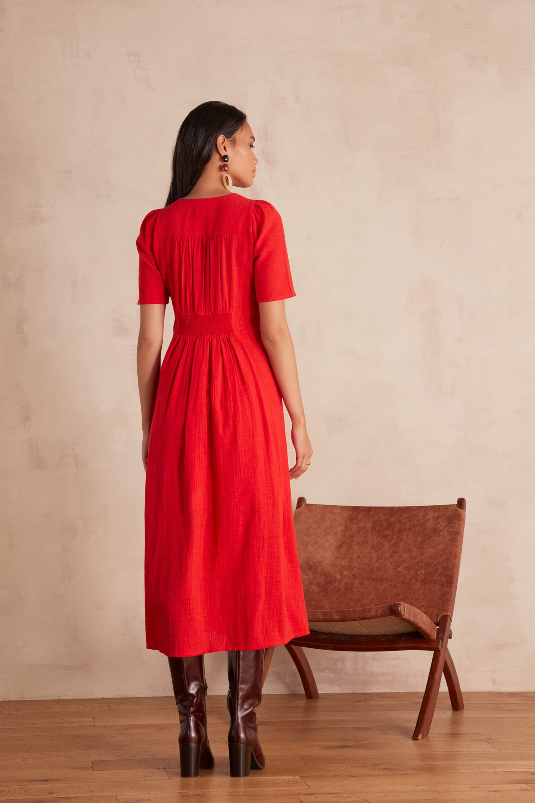 Opt for boots and a burgundy leather jacket to enhance this dress by playing with shades of red.