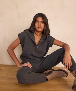 Create a soft look by layering a turtleneck and a matching zipped jumper. Finish with beige boots for a balanced silhouette.