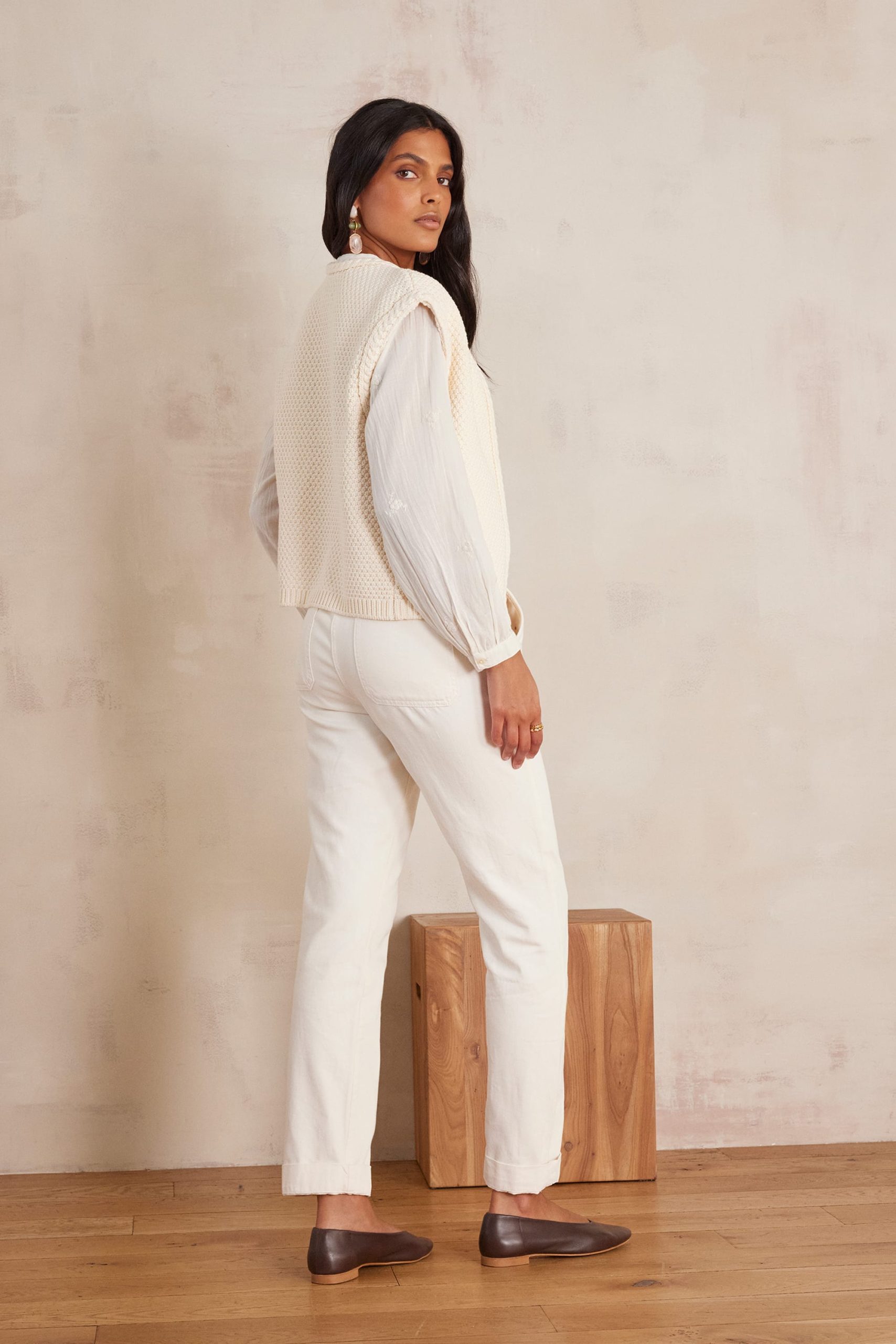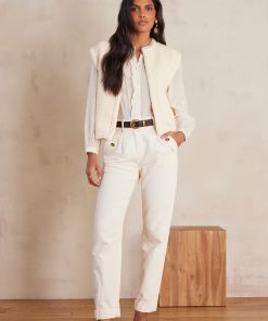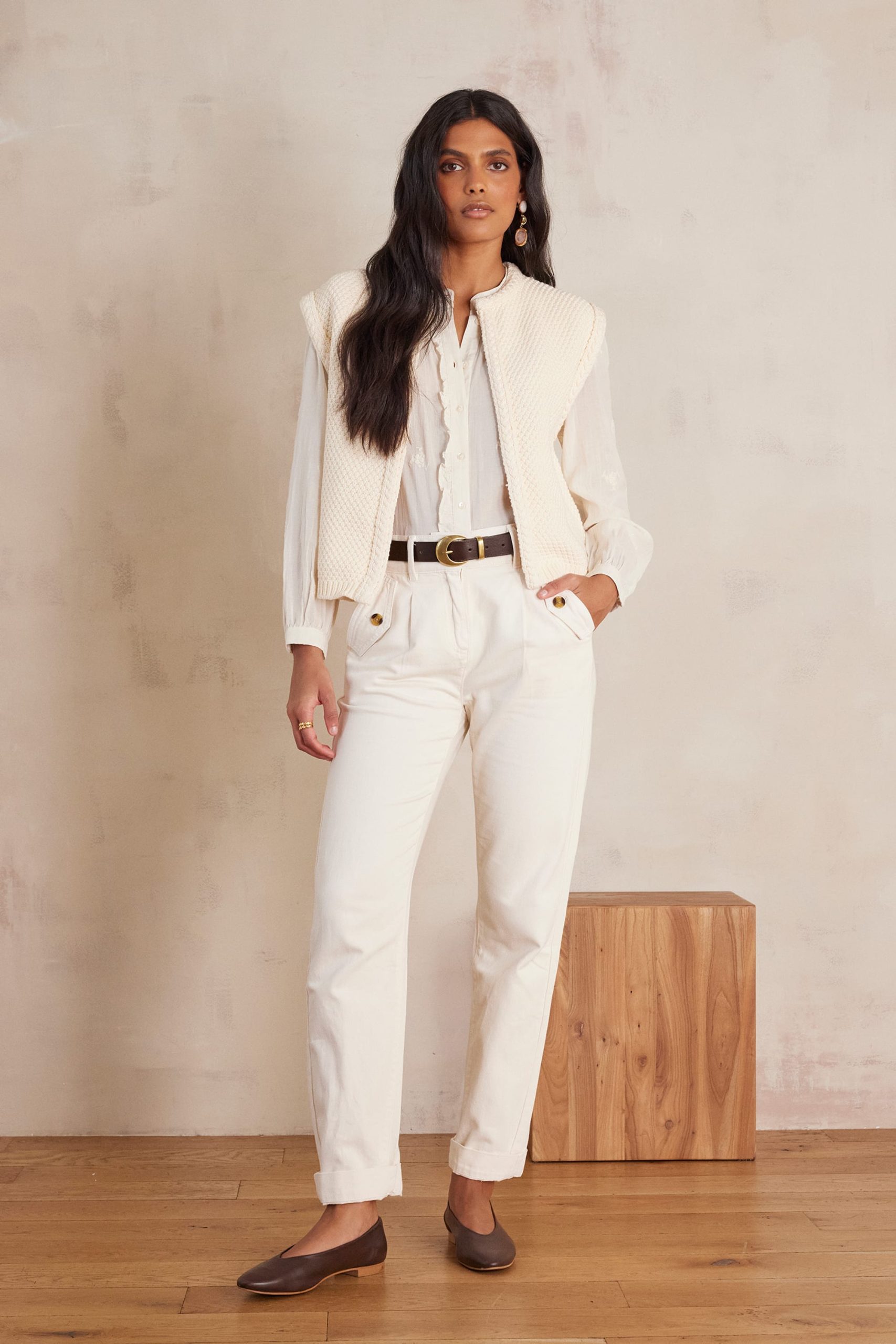 Sam is 1m72 tall and wears size 36. With the MATEO trousers, the model wears the BETSY jacket and the SIENA blouse.