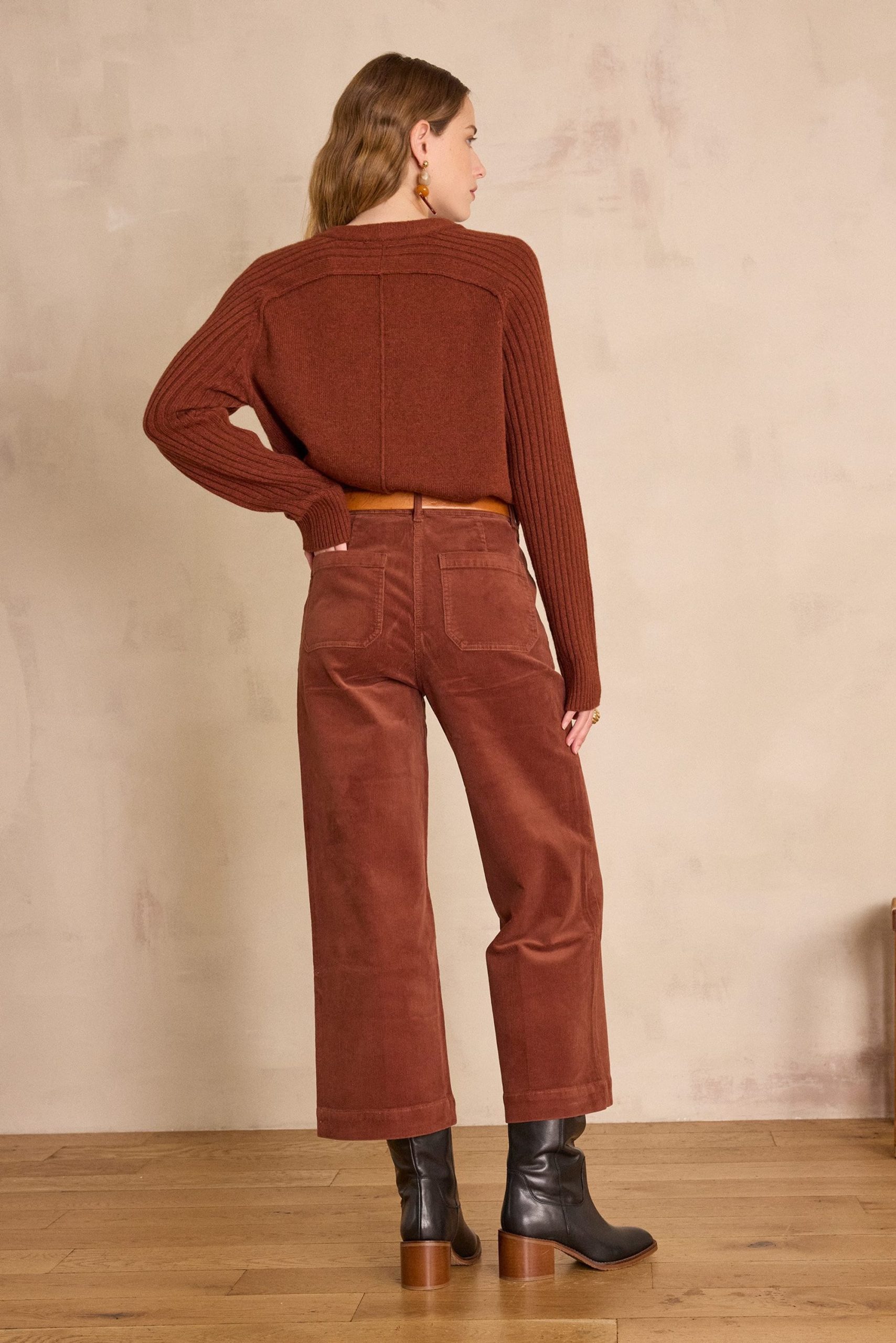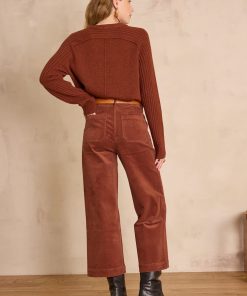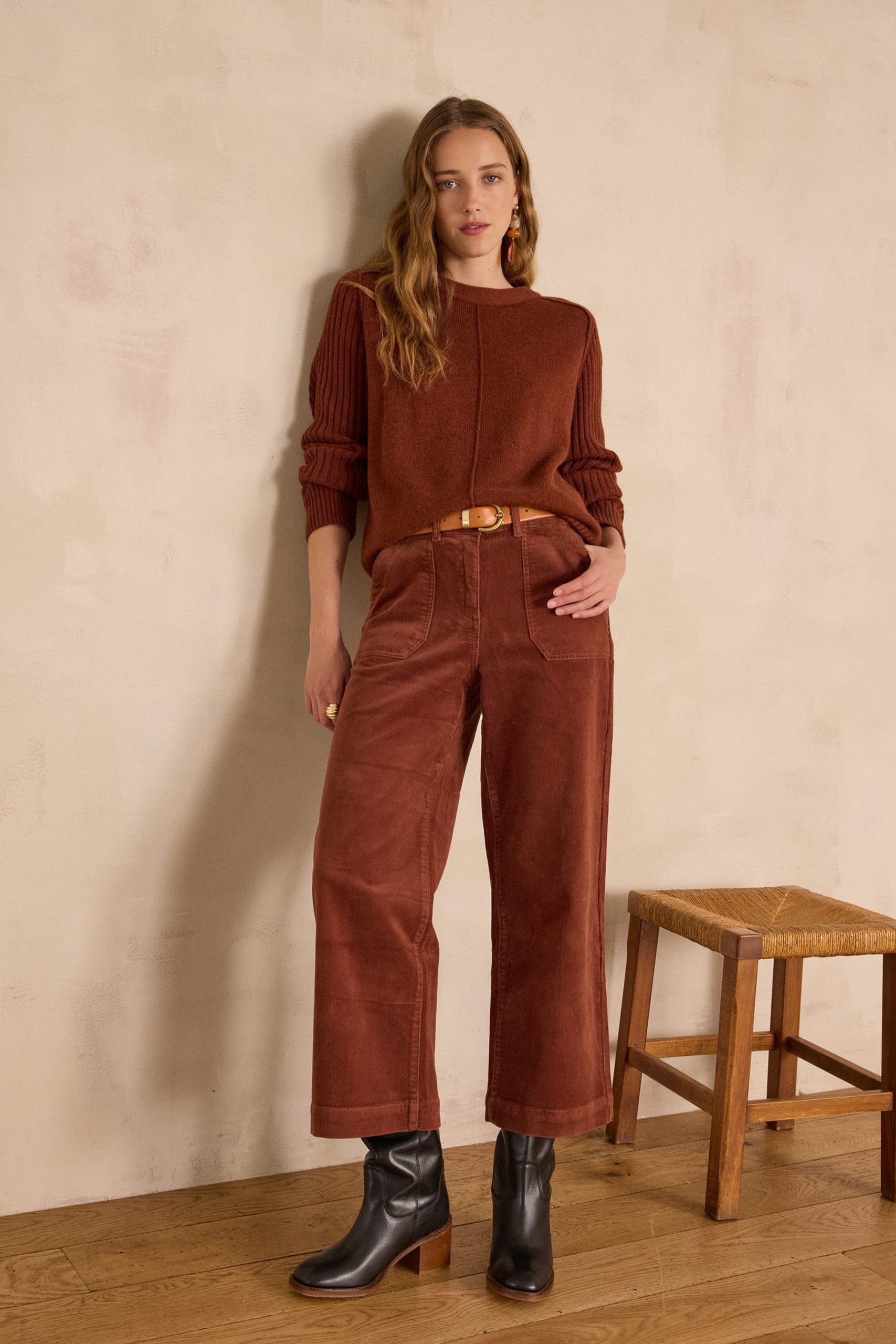 Wear these brick-coloured trousers with a jumper in a similar shade, a thin belt to structure the silhouette, and brown leather boots for a harmonious and elegant look.